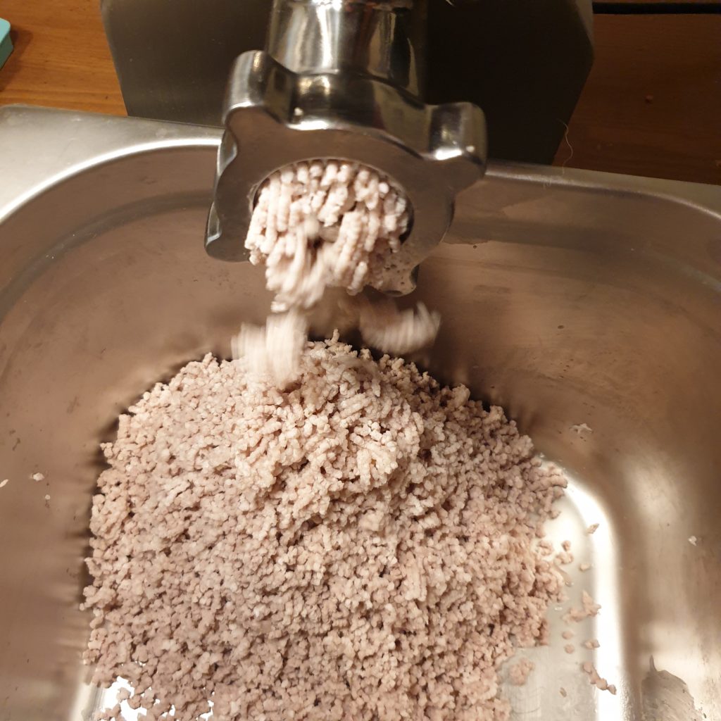 - Die Hälfte von Bauch, Leber und Zwiebeln wird nun durch die 2mm Scheibe, die andere Hälfte durch die 5 oder 8mm Scheibe gedreht, je nachdem wie grob Du die Leberwurst magst.